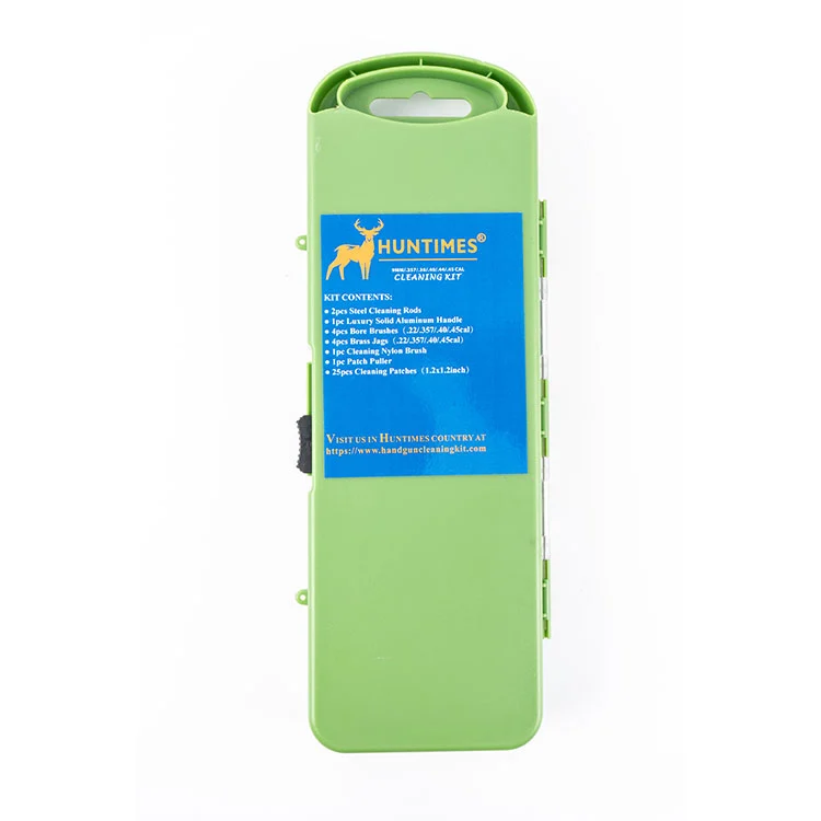 Mūsų 9MM/.357/.38/.40/.44/.45 kalibro valymo rinkinys, sukurtas jūsų pistoletui, turi OEM tinkintą rankenos logotipą ir pakuotę. Šis universalus valymo rinkinys puikiai tinka medžioklės entuziastams ir pateikiamas su priedų rinkiniu, pritaikytu pagal jūsų poreikius. Rinkinį sudaro du žalvariniai valymo strypai, patvari plastikinė rankena, valymo nailoninis šepetys, dvidešimt penki valymo pleistrai, keturių skirtingų kalibrų kamerų šepečiai, keturi žalvariniai dantukai, plastikinis lopų traukiklis ir žalvarinis pleistrų traukiklis.